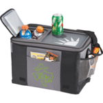 Unique design of this large cooler with easy access lid and patented Table Top™ function makes it perfect for outdoor events and road trips. Zippered main compartment holds up to 50 cans. SuperFoam® insulation. Exterior slip pocket. Dual exterior side carry handles. Backsaver® technology combats the strain of carrying a loaded cooler. Ultra Safe™ leak-proof, easy clean PEVA lining. Collapses for easy storage.