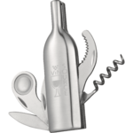 Clever bottle-shaped tool serves five unique functions. Functions include corkscrew, bottle opener, knife blade, serrated blade and magnifying glass for label reading.