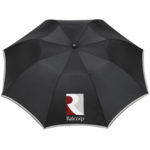Automatic opening. 1 mm reflective material surrounding the canopy and case for optimal visibility at night. Pongee canopy with matching color case. Two-section folding metal shaft. Ergonomic matte black plastic handle with wrist strap. Folds to only 15" long. Available for one-day turn with Sureship®. Retail-Style Packaging Available For This Product - 2051-02BK Umbrella Gift Box- Medium