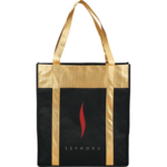 The Metallic Non-Woven Shopper Tote adds some shine to the basic shopper tote. Featuring an open main compartment it has metallic accents throughout the tote and includes 22 inch handles.