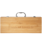 Grill out in style with this 5-piece premium BBQ set. Bamboo case is both functional and decorative. Tools are full size, durable stainless steel with bamboo handles. Set features tongs, knife, fork, spatula, and basting brush. Due to the nature of the bamboo material, variations in laser imprinting quality may occur.